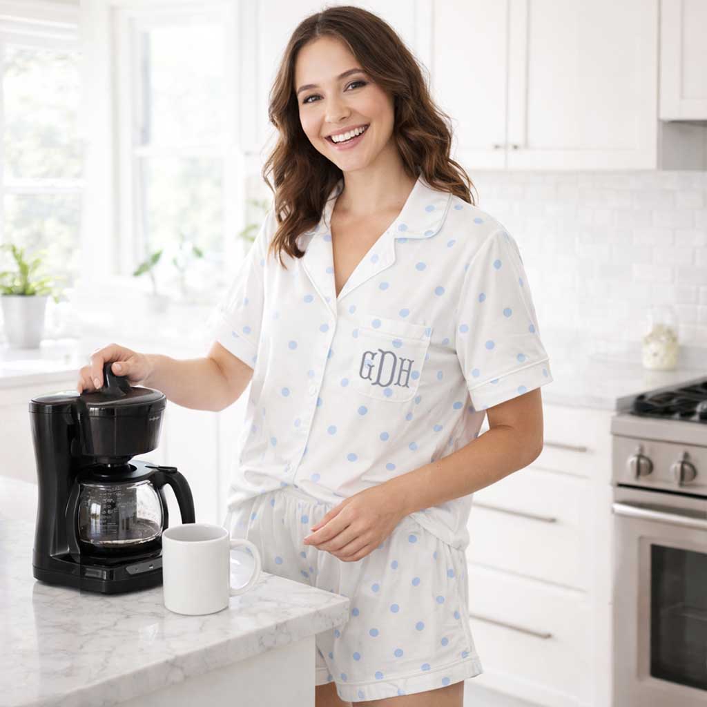 Perfect for the big day and beyond, this polka dot pajama set features a short sleeve button-up top and comfy stretch waistband shorts. This playful pajama set is silky soft and light for warmer temps—add personalization for a meaningful, custom touch.
